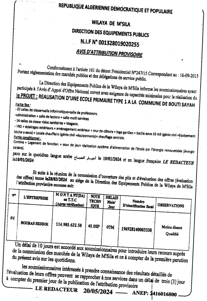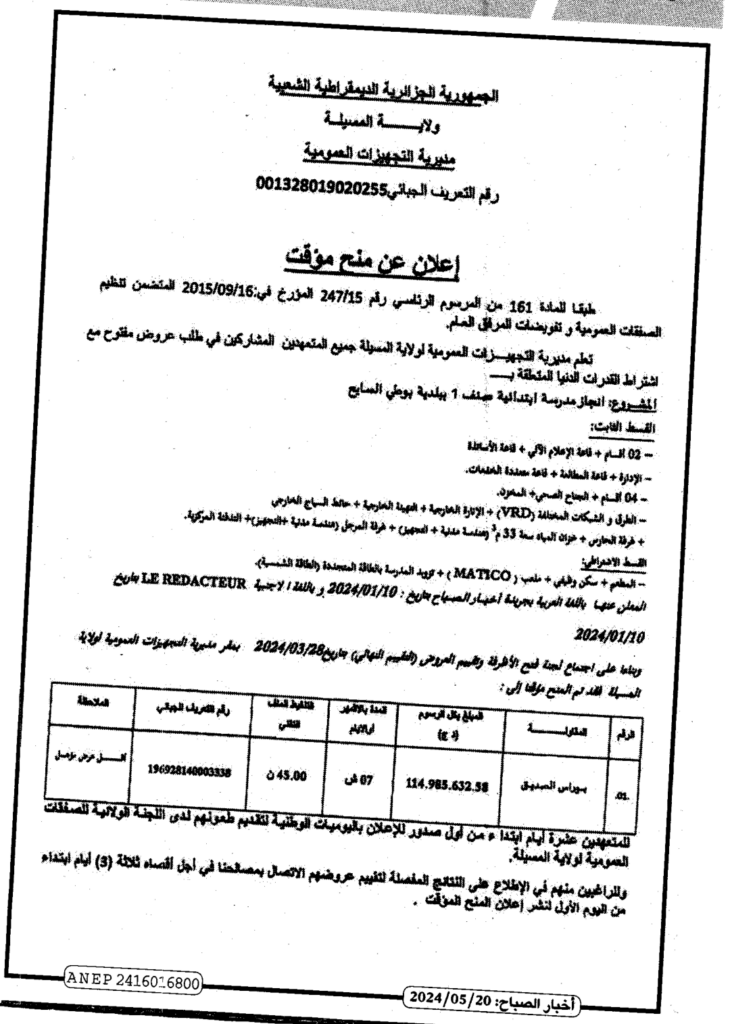 إعلان عن منح مؤقت لمشروع إنجاز مدرسة ابتدائية صنف 01 ببلدية بوطي السايح/ مديرية التجهيزات العمومية لولاية المسيلة
