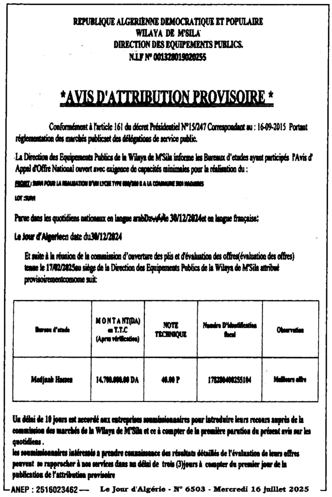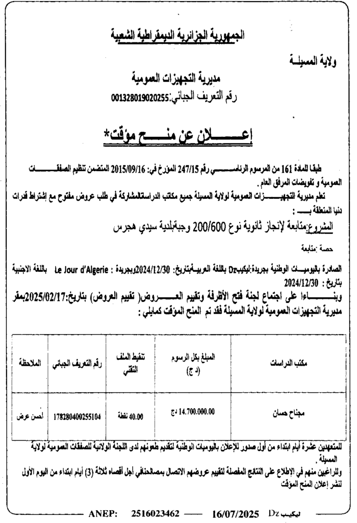 إعلان عن منح مؤقت متابعة لانجاز متوسطة نوع 200/600 وجبة ببلدية سيدي هجرس/ مديرية التجهيزات العمومية لولاية المسيلة