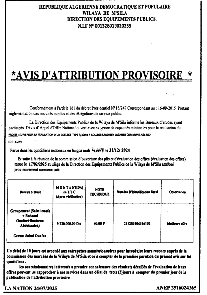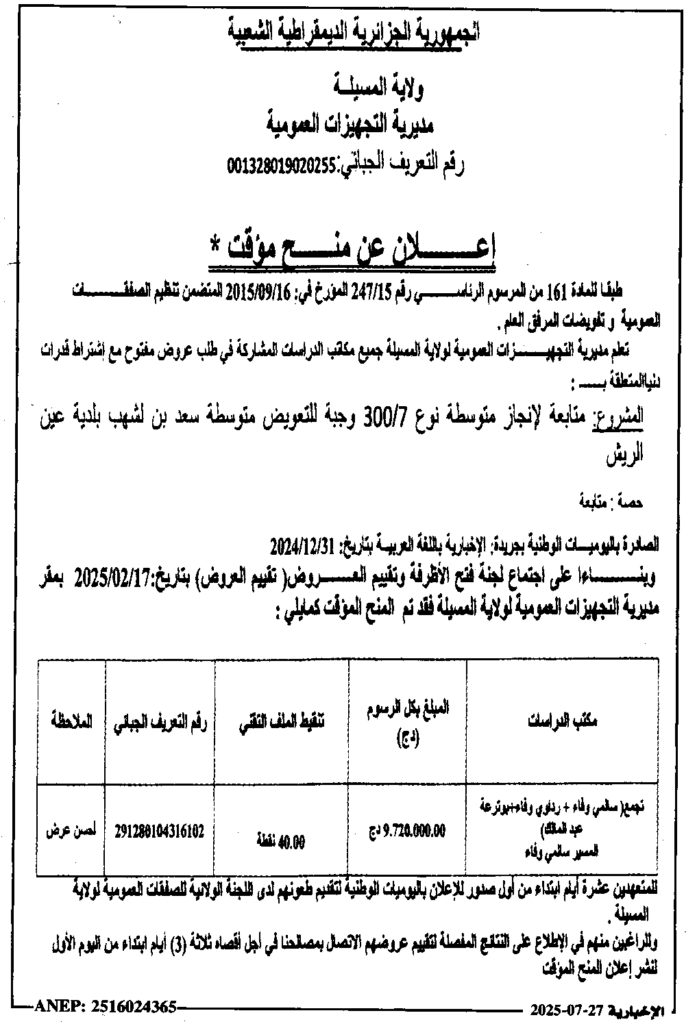 إعلان عن منح مؤقت متابعة لانجاز متوسطة نوع 300/7 وجبة للتعويض متوسطة سعد بن لشهب بلدية عين الريش/ مديرية التجهيزات العمومية لولاية المسيلة