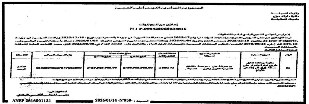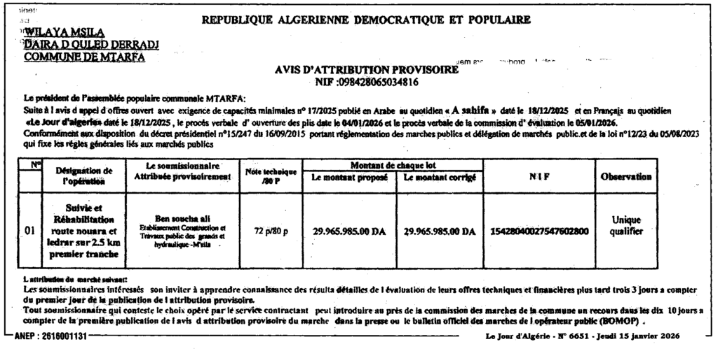 إعلان عن منح مؤقت متابعة وإعادة تأهيل طريق نوارة/ بلدية المطارفة