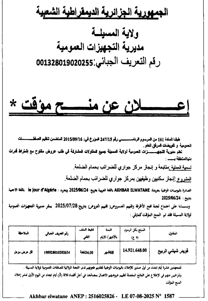 إعلان عن منح مؤقت متابعة وانجاز مركز جواري للضرائب بحمام الضلعة/ مديرية التجهيزات العمومية لولاية المسيلة
