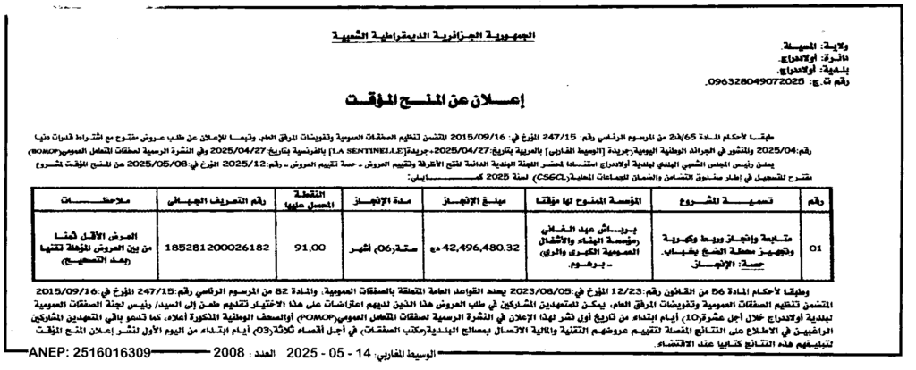 إعلان عن منح مؤقت متابعة وانجاز وربط وكهربة وتجهيز محطة الضخ/ بلدية أولاد دراج
