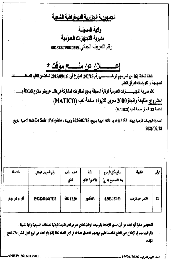 إعلان عن منح مؤقت متابعة وانجاز 2000 سرير ايواء ساحة لعب (Matico) مديرية التجهيزات العمومية لولاية المسيلة