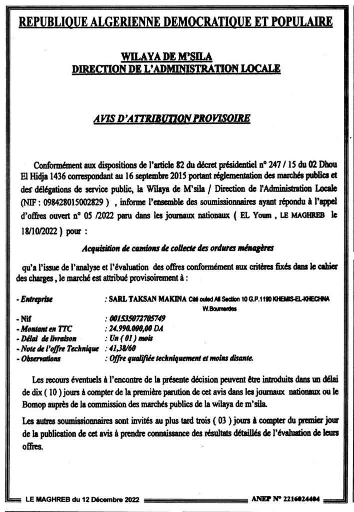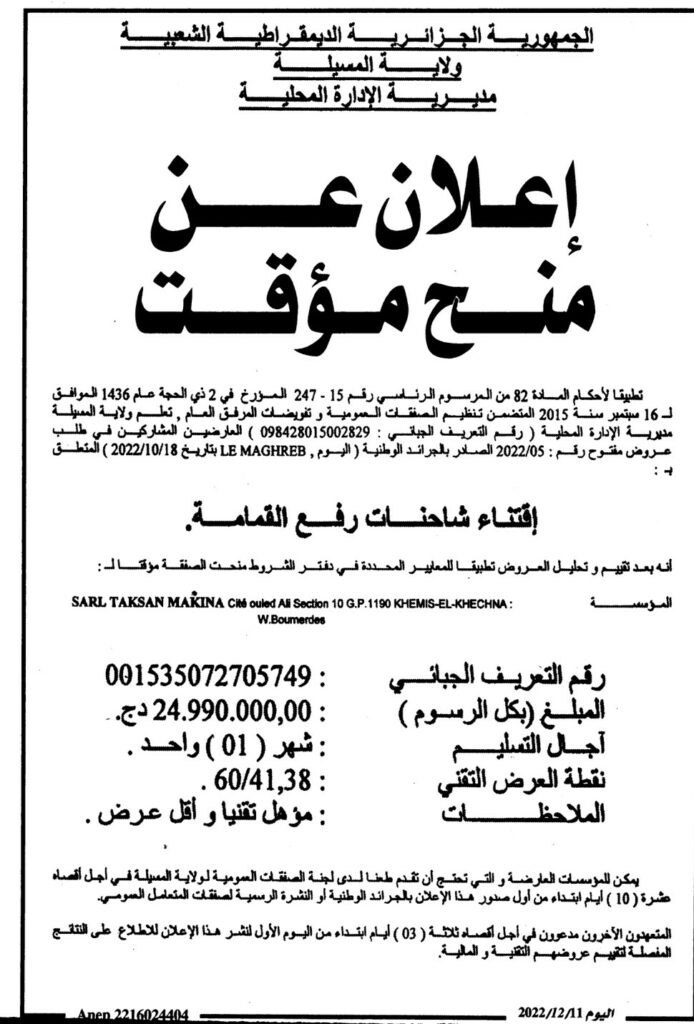 طلب عروض مفتوحرقم 2022/05 المتعلق بـ: إقتناء شاحنات رفع القمامة11 ديسمبر، 20220 9 شاركها فيسبوك X مشاركة عبر البريد طباعة