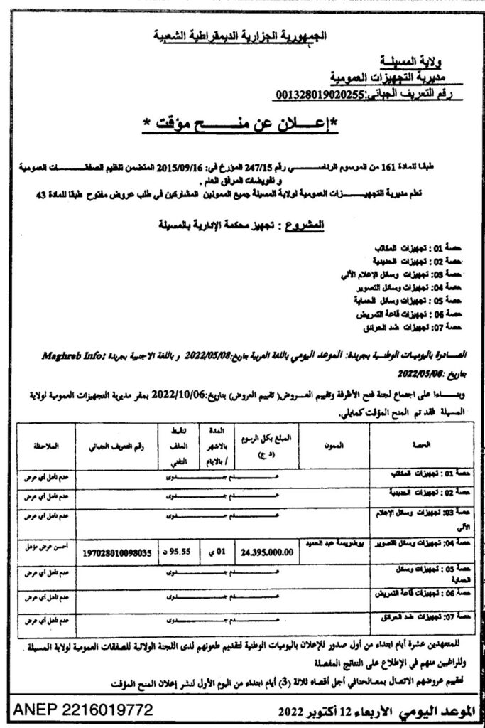 طلب عروض مفتوح للمشروع: تجهيز محكمة الإدارية بالمسيلة (07 حصص)12 أكتوبر، 20220 16 شاركها فيسبوك X مشاركة عبر البريد طباعة