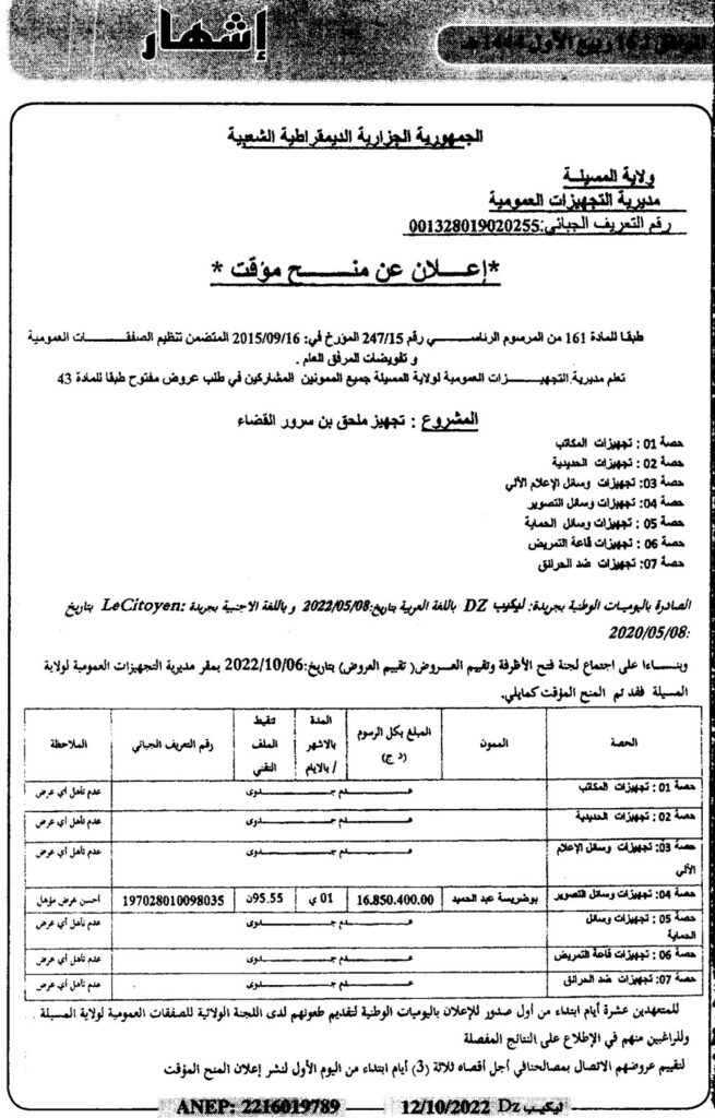 طلب عروض مفتوح للمشروع: تجهيز ملحق ببن سرور القضاء (07 حصص)12 أكتوبر، 20220 25 شاركها فيسبوك X مشاركة عبر البريد طباعة