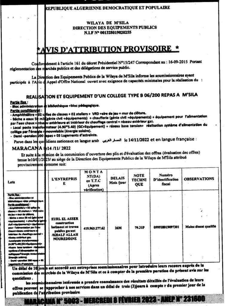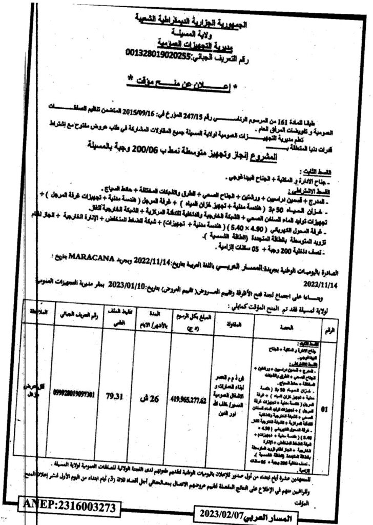 طلب عروض مفتوح مع اشتراط قدرات دنيا المتعلقة بـ المشروع: إنجاز وتجهيز متوسطة نمط ب 200/06 وجبة بالمسيلة7 فبراير، 20230 6 شاركها فيسبوك X مشاركة عبر البريد طباعة