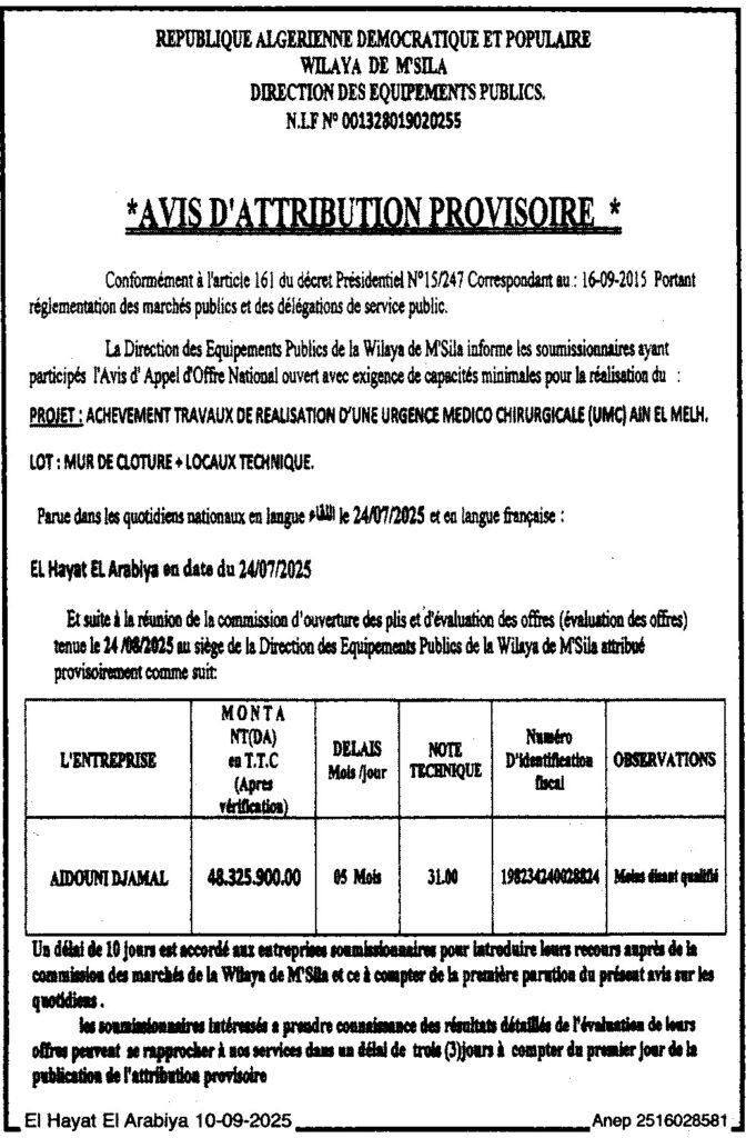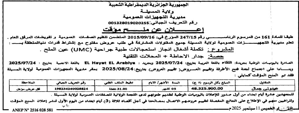 إعلان عن منح مؤقت تكملة انجاز استعجالات طبية جراحية (UMC) عين الملح/ مديرية التجهيزات العمومية لولاية المسيلة