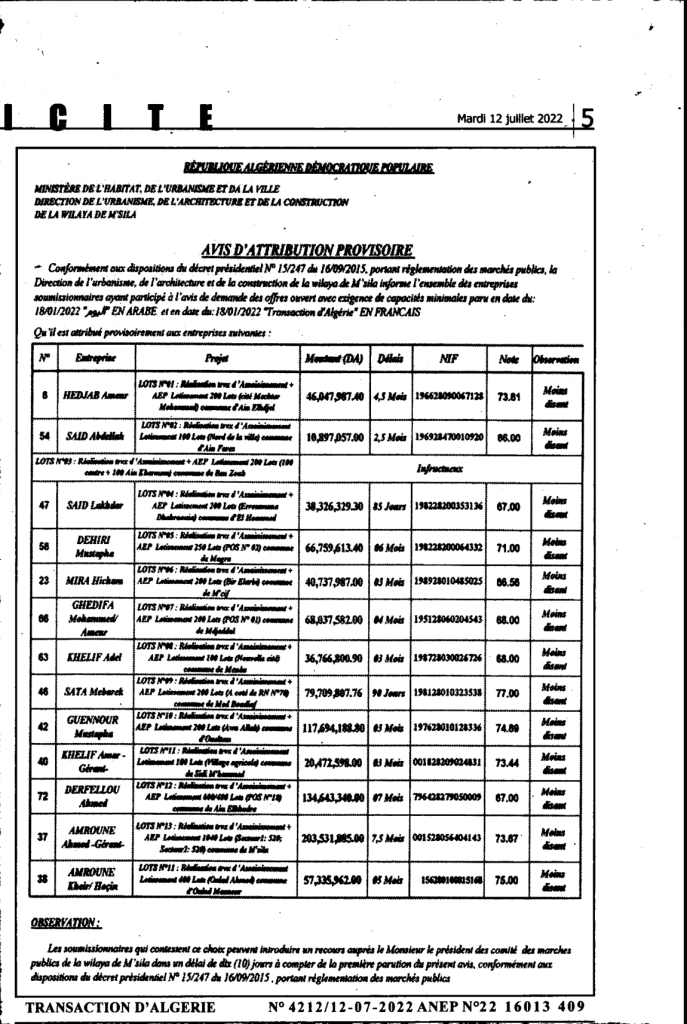 إعلان عن منح مؤقت: مديرية التعمير والبناء المعماري