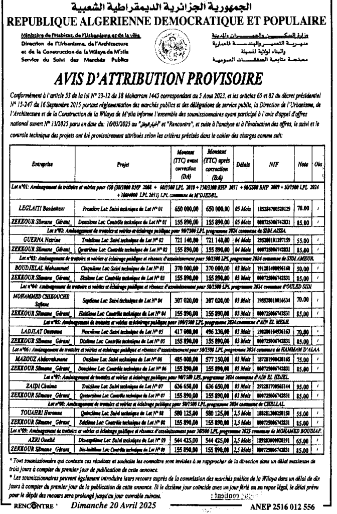إعلان عن منح مؤقت/ مديرية التعمير والهندسة المعمارية لولاية المسيلة