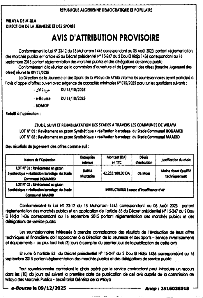 إعلان عن منح مؤقت/ مديرية الشباب والرياضة لولاية المسيلة
