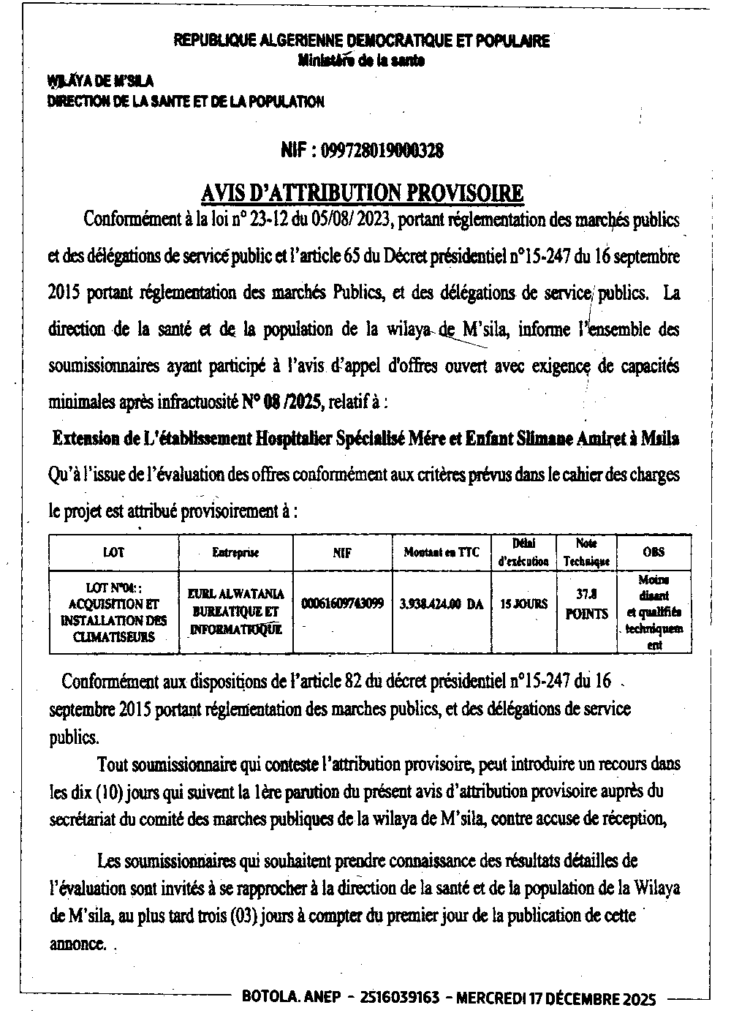 إعلان عن منح مؤقت/ مديرية الصحة والسكان لولاية المسيلة