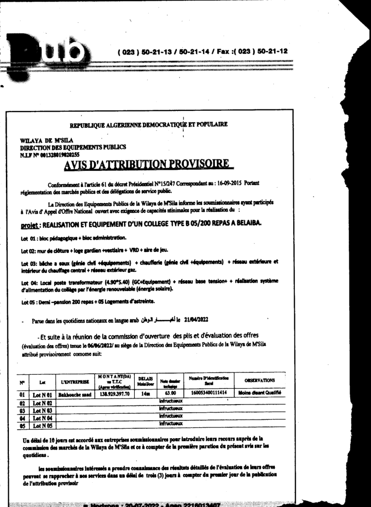 إعلان عن منح مؤقت مشروع انجاز وتجهيز وجبة كاملة نمط 200/05 ببلعايبة مديرية التجهيزات العمومية