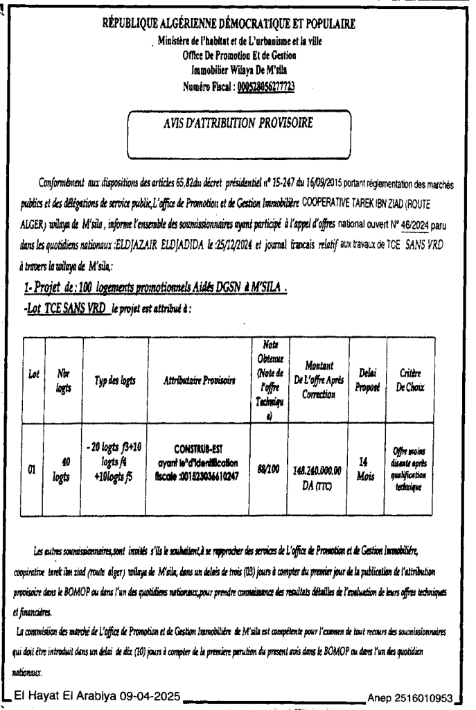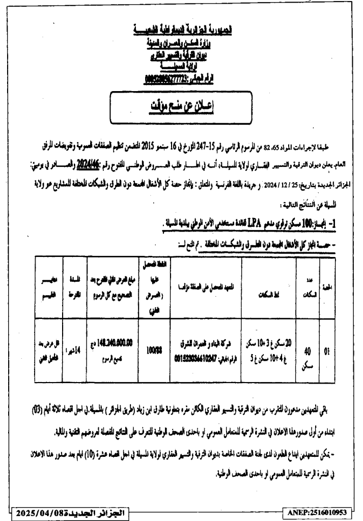 إعلان عن منح مؤقت نجاز 100 مسكن ترقوي مدعم LPA فائدة مستخدمي الأمن الوطني ببلدية المسيلة/ ديوان الترقية والتسيير والعقاري لولاية المسيلة