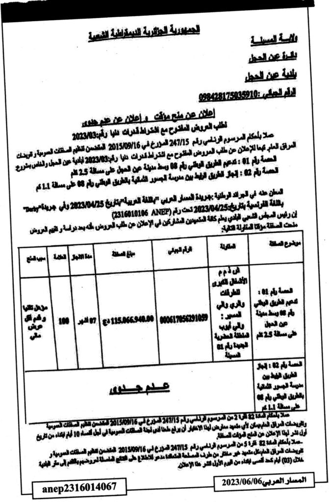 إعلان عن منح مؤقت وإعلان عن عدم جدوى لطلب العروض المفتوح 2023/03 بلدية عين الحجل