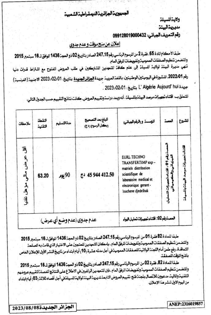 إعلان عن منح مؤقت وعدم جدوى: اقتناء تجهيزات مرصد البيئة/ مديرية البيئة لولاية المسيلة
