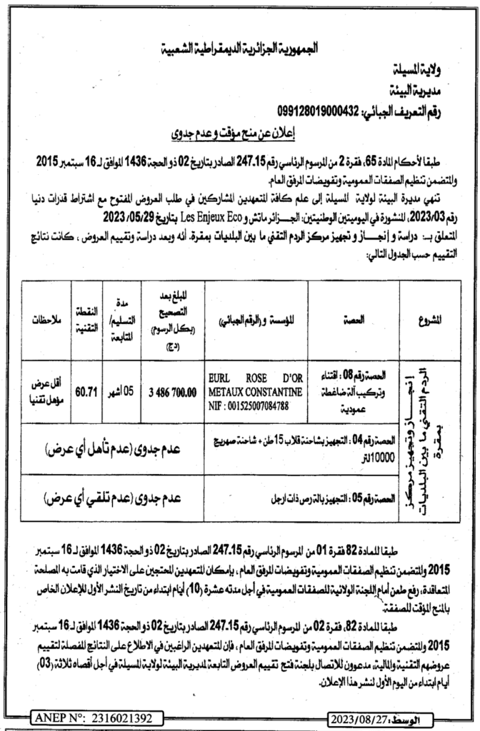 إعلان عن منح مؤقت وعدم جدوى/ مديرية البيئة لولاية المسيلة