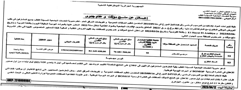 إعلان عن منح مؤقت وعدم جدوى/ مديرية الخدمات الجامعية المسيلة القطب