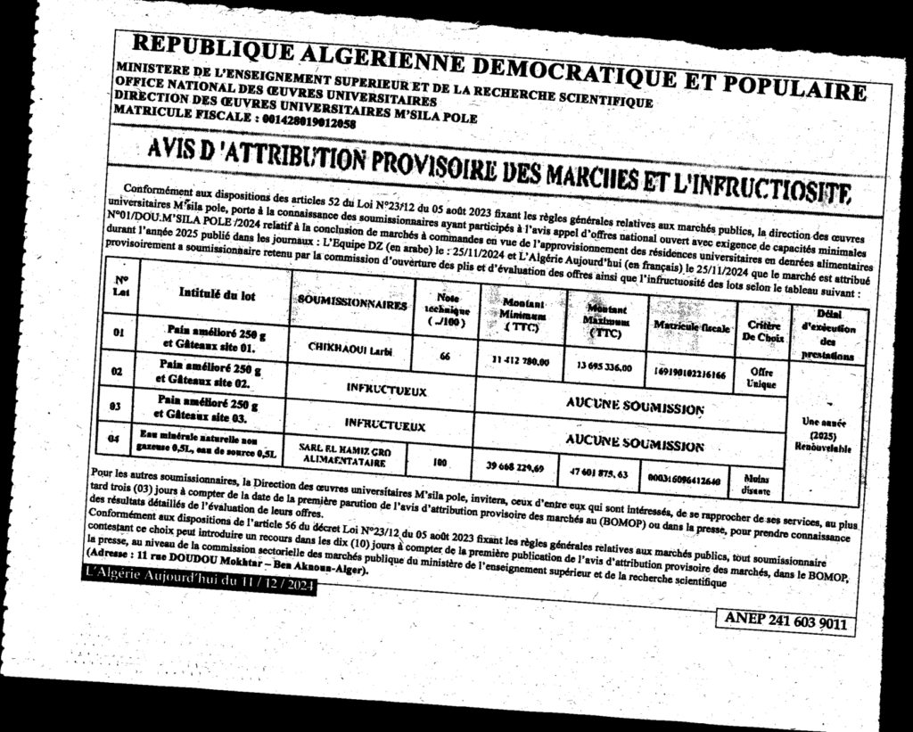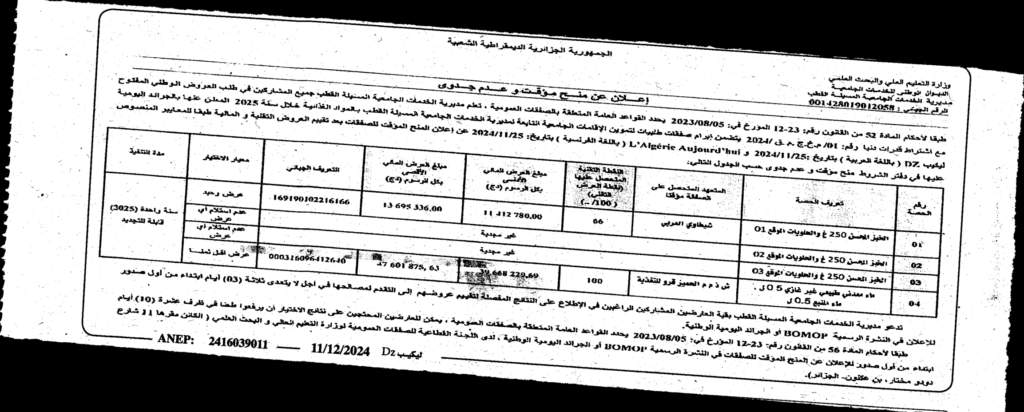 إعلان عن منح مؤقت وعدم جدوى/ مديرية الخدمات الجامعية المسيلة القطب