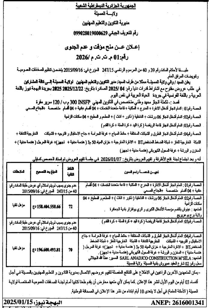 إعلان عن منح مؤقت وعدم جدوى 2026/01 مديرية التكوين والتعليم المهنيين