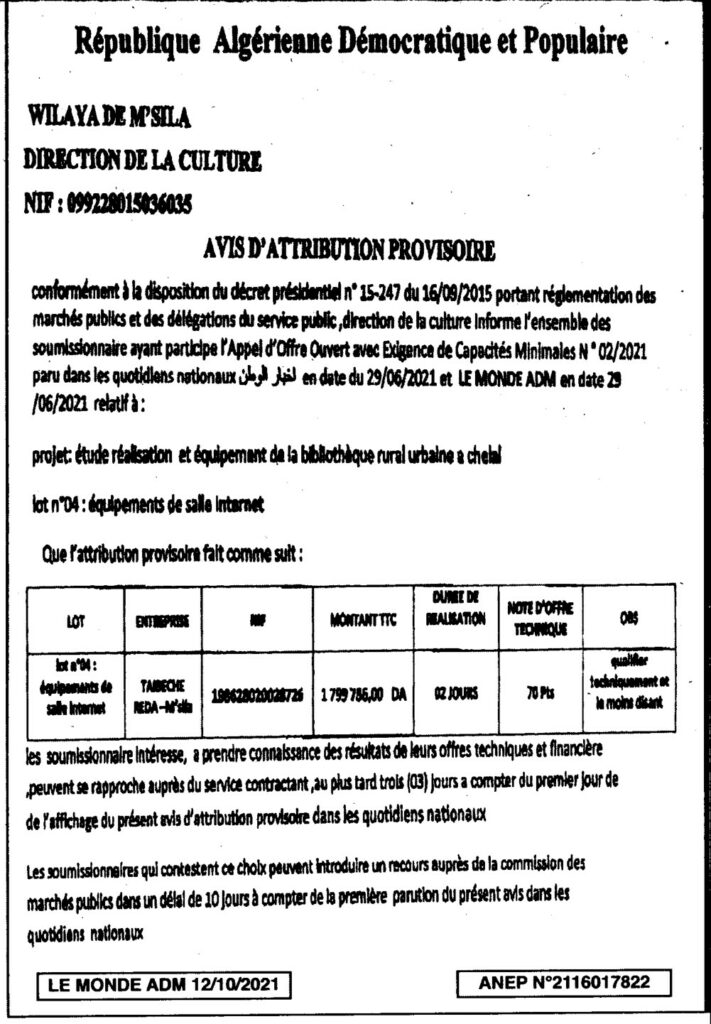 إعلان عن منح مؤقت يوم 12 أكتوبر 2021 مديرية الثقافة لولاية المسيلة
