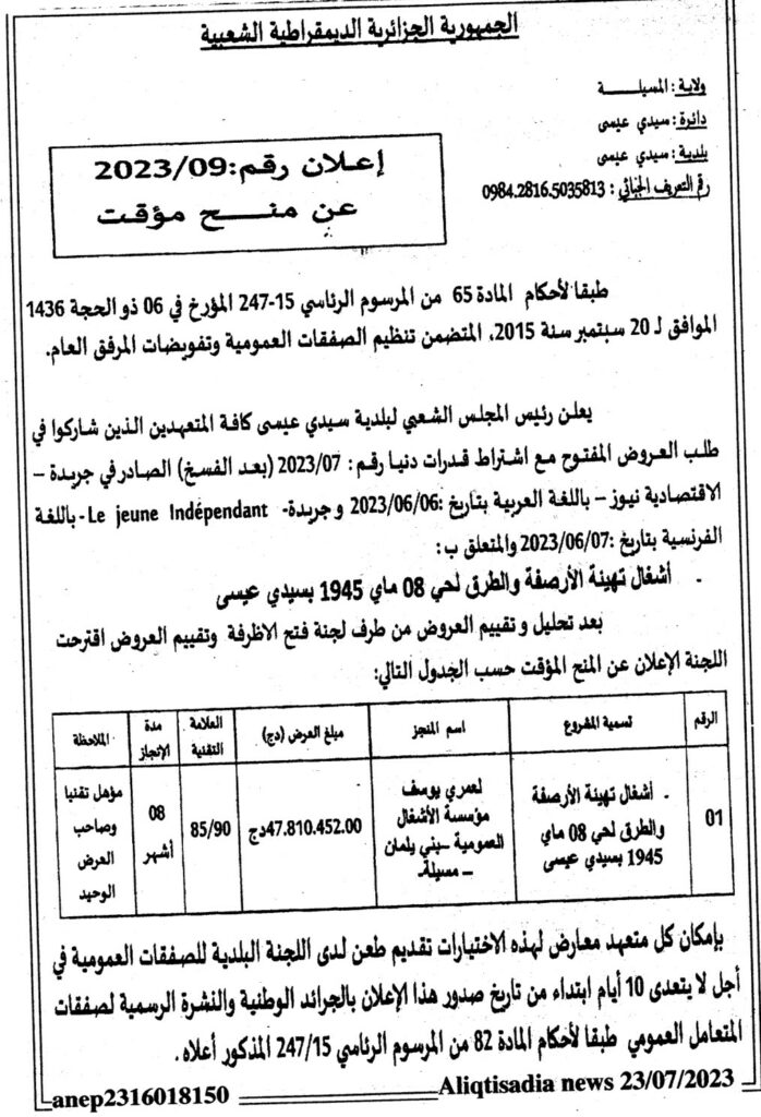 إعلان عن منح مؤقت 09/2023 بلدية سيدي عيسى