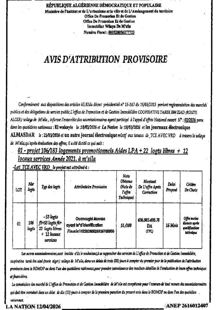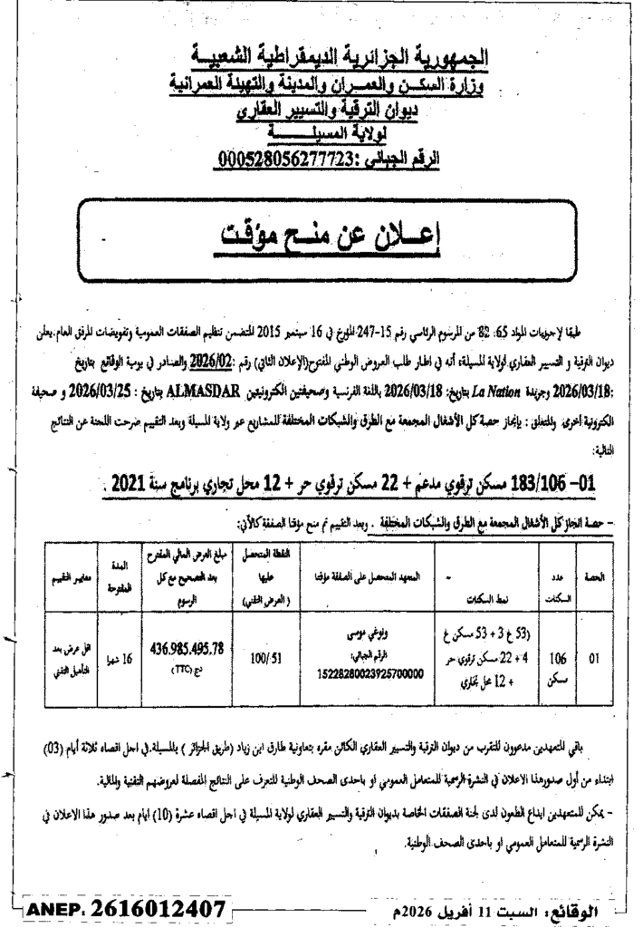 إعلان عن منح مؤقت 183/106 مسكن ترقوي مدعم +22 مسكن ترقوي حر +12 محل تجاري/ ديوان الترقية والتسيير العقاري لولاية المسيلة