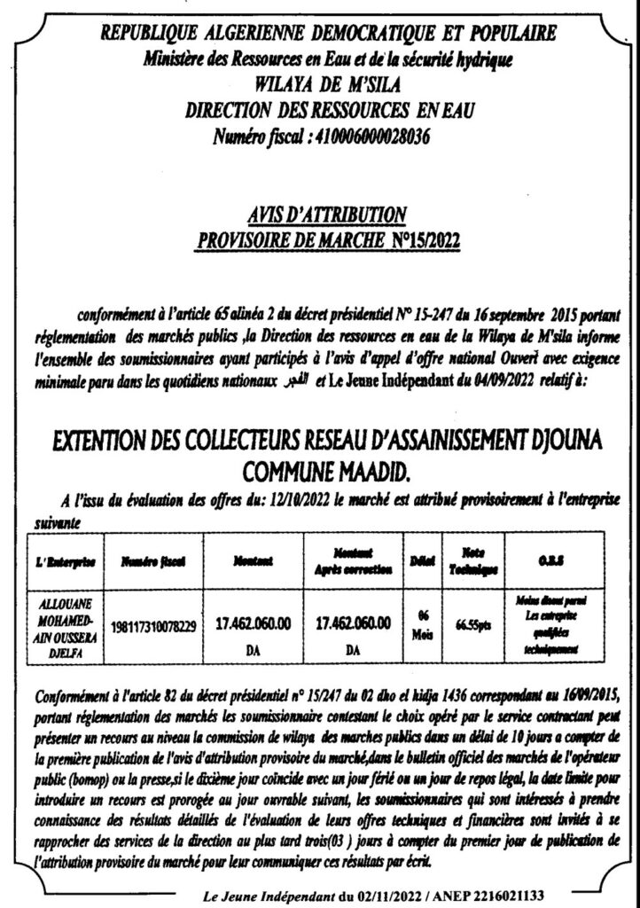 إعلان عن منح مؤقت 2022/15 مديرية الموارد المائية