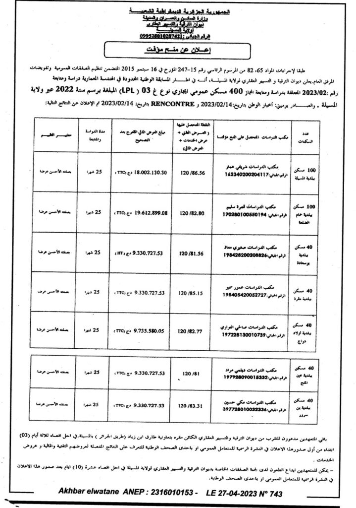 إعلان عن منح مؤقت 2023/02 دراسة ومتابعة انجاز 400 مسكن عمومي ايجاري نوع (غ03) LPL عبر ولاية المسيلة سنة 2022