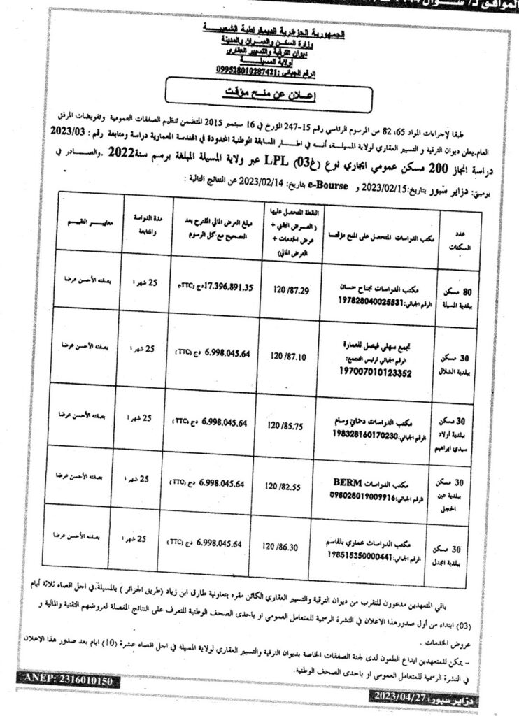 إعلان عن منح مؤقت 2023/03 دراسة وانجاز 200 مسكن عمومي ايجاري نوع (غ03) LPL عبر ولاية المسيلة سنة 2022