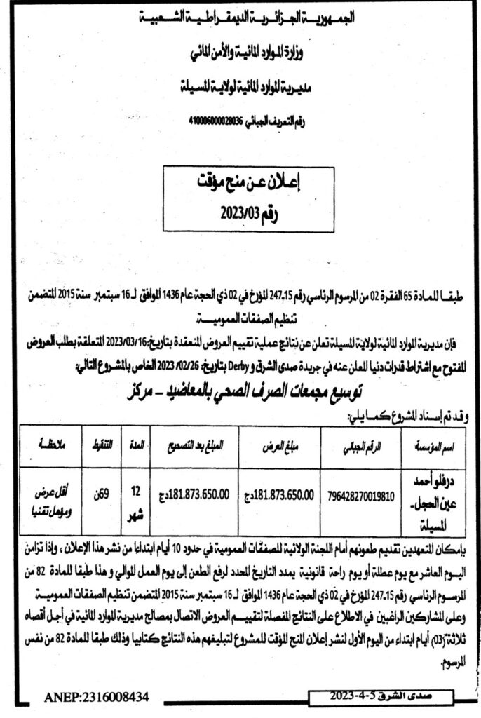 إعلان عن منح مؤقت 2023/03 مديرية الموارد المائية لولاية المسيلة