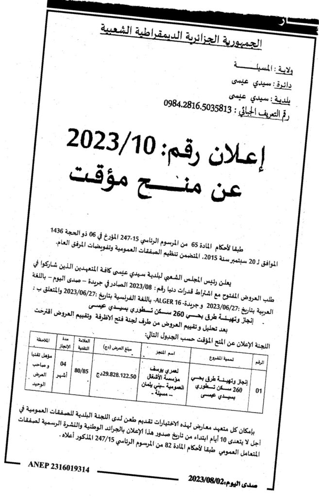 طلب عروض مفتوح مع اشتراط قدرات دنيا المتعلق بـ : انجاز وتهية الطرق بحي 260 سكن تطوري بسيدي عيسى3 أغسطس، 20230 4 شاركها فيسبوك X مشاركة عبر البريد طباعة