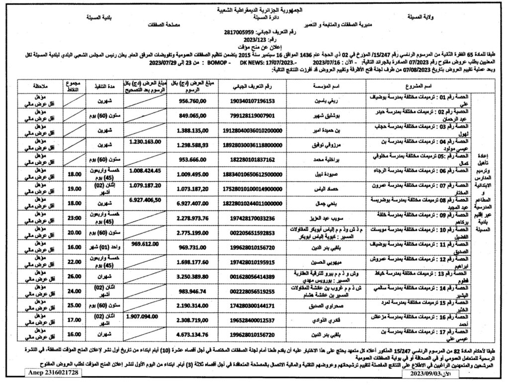 إعلان عن منح مؤقت 2023/123 بلدية المسيلة