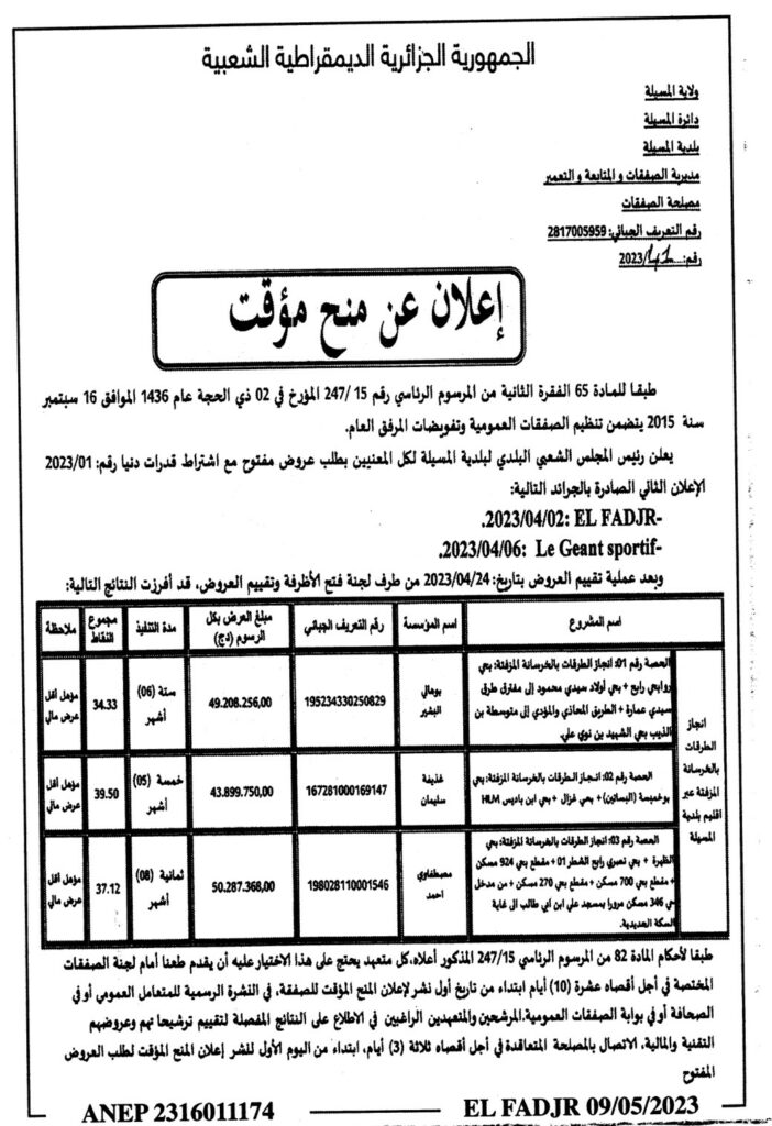 إعلان عن منح مؤقت 2023/41: انجاز الطرقات بالخرسانة المزفتة عبر اقليم بلدية المسيلة