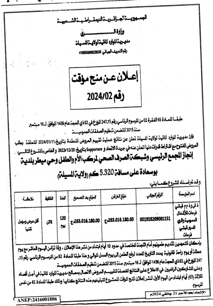 إعلان عن منح مؤقت 2024/02 مديرية الموارد المائية لولاية المسيلة