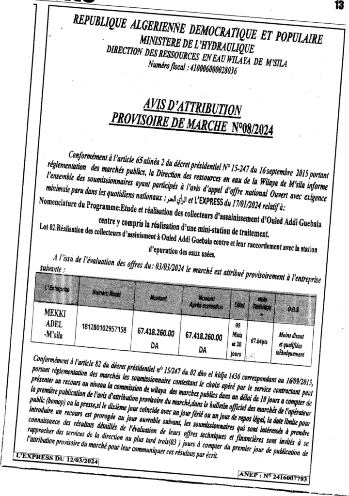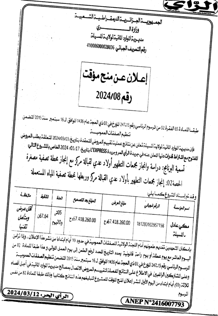 إعلان عن منح مؤقت 2024/08 مديرية الموارد المائية لولاية المسيلة