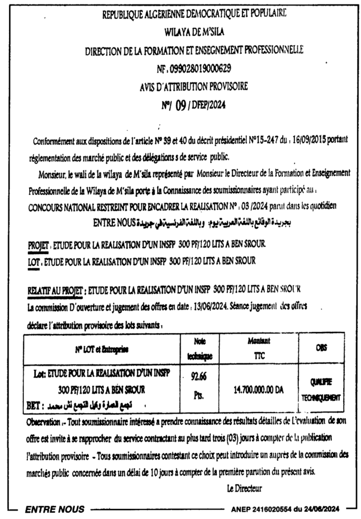 إعلان عن منح مؤقت 2024/09 مديرية التكوين والتعليم المهنيين لولاية المسيلة