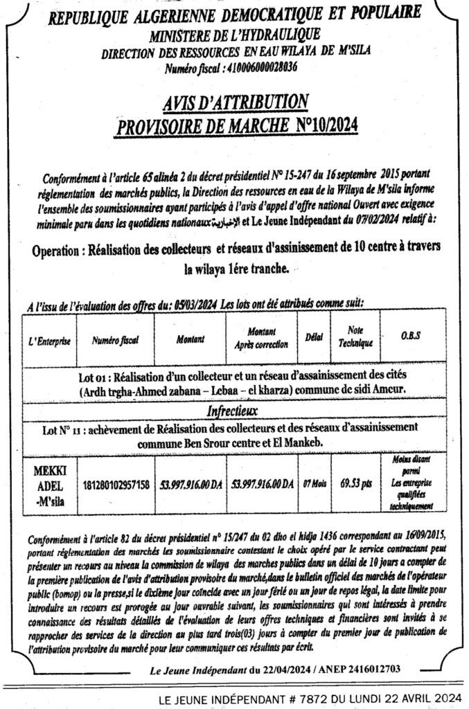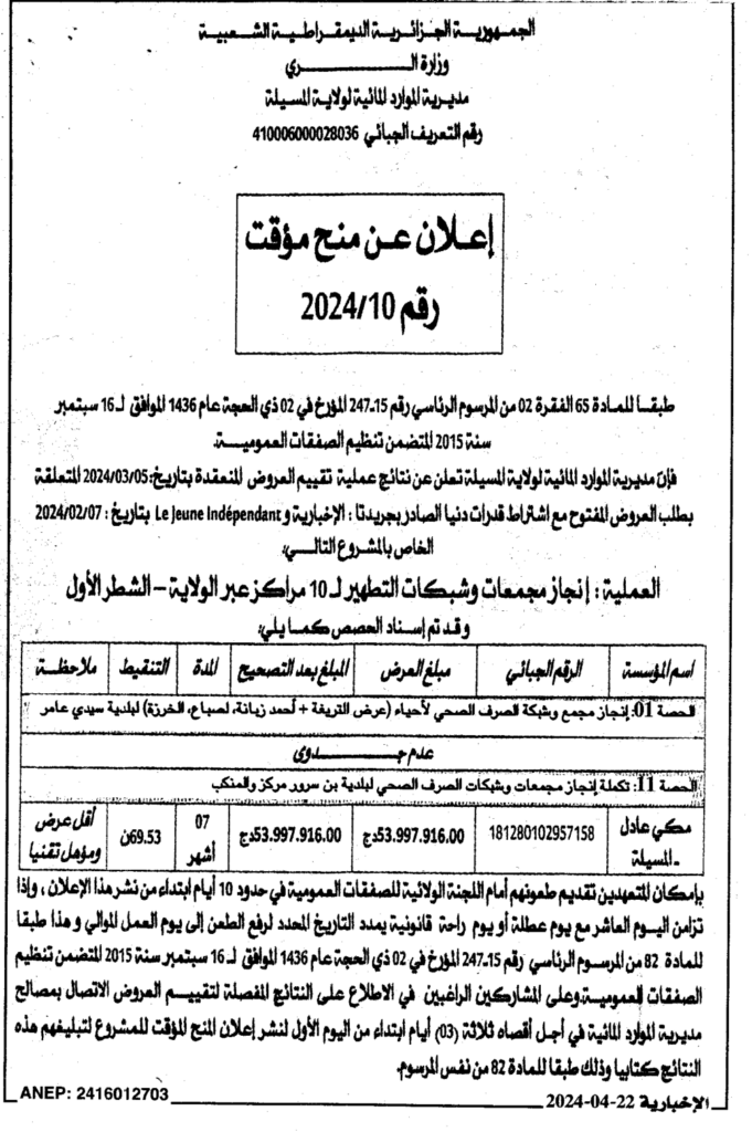 إعلان عن منح مؤقت 2024/10 مديرية الموارد المائية لولاية المسيلة