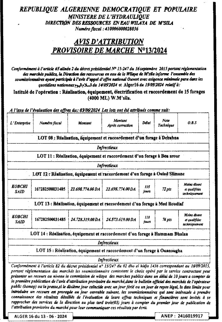 إعلان عن منح مؤقت 2024/13 مديرية الموارد المائية لولاية المسيلة