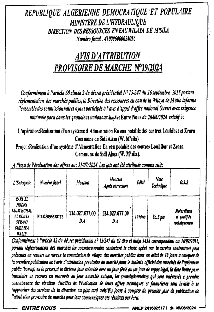 إعلان عن منح مؤقت 2024/19 مديرية الموارد المائية لولاية المسيلة