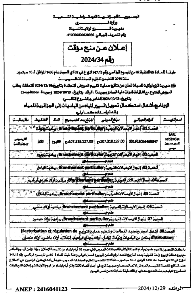 إعلان عن منح مؤقت 2024/34 مديرية الري لولاية المسيلة