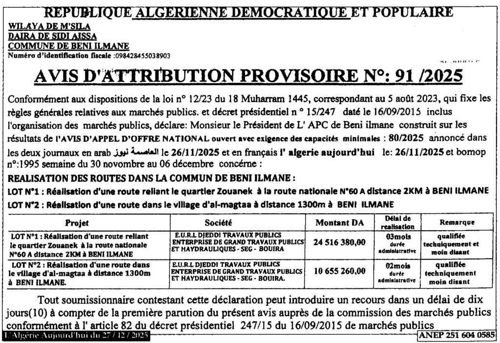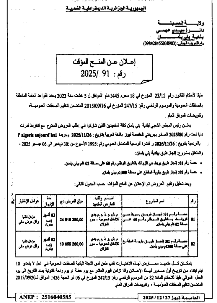 إعلان عن منح مؤقت 2025/91 بلدية بني يلمان