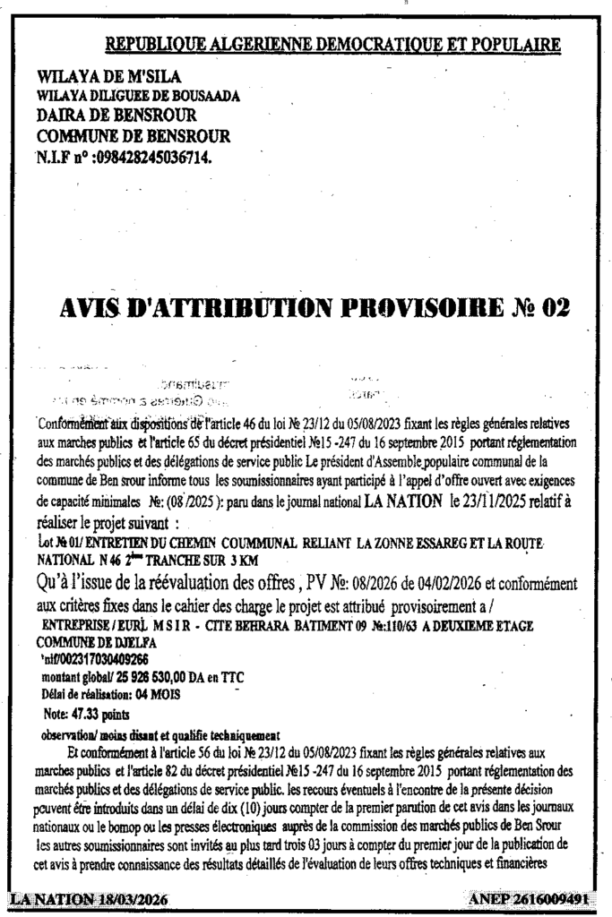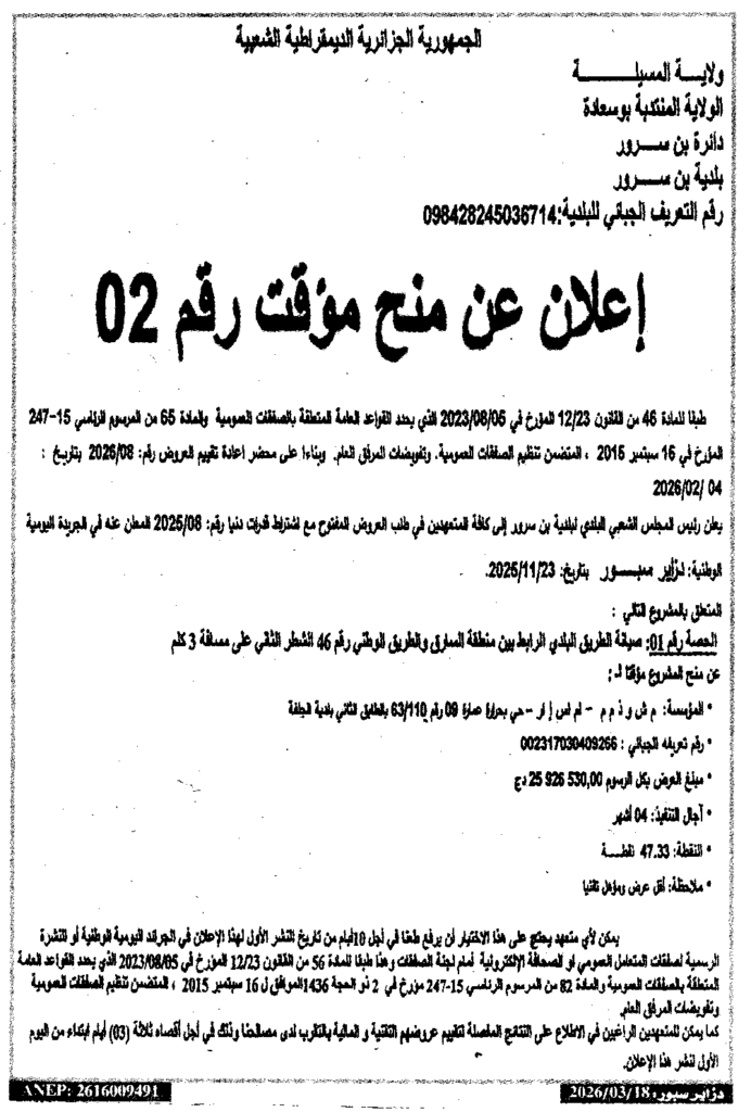 إعلان عن منح مؤقت 2026/02 بلدية بن سرور