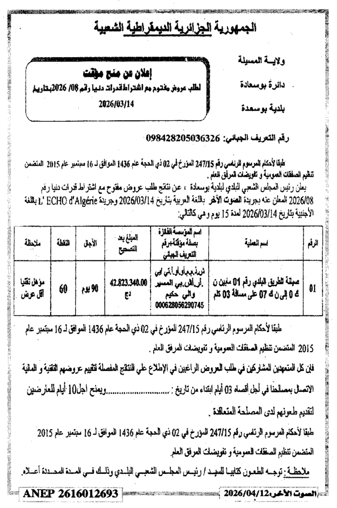 إعلان عن منح مؤقت 2026/08 بلدية بوسعادة