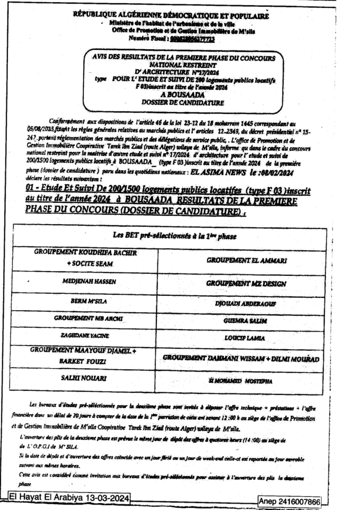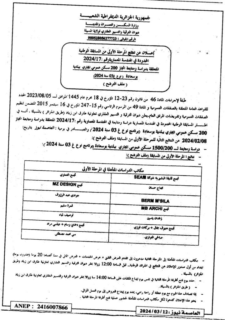 إعلان عن نتائج المرحلة الأولى من المسابقة الوطنية المحدودة في الهندسة المعمارية 2024/17: دراسة ومتابعة انجاز 200 مسكن عمومي ايجاري ببلدية بوسعادة/ ديوان الترقية والتسيير العقاري لولاية المسيلة