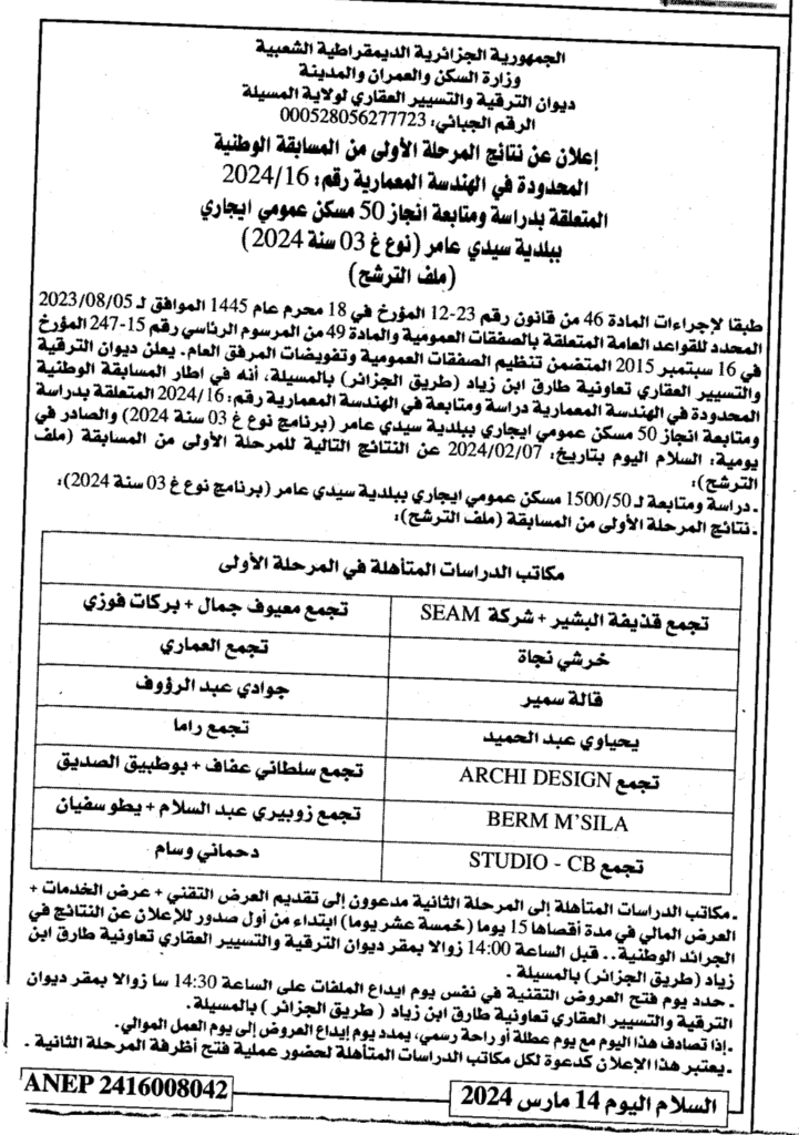 إعلان عن نتائج المرحلة الأولى من المسابقة الوطنية المحدودة في الهندسة المعمارية 2024/16: دراسة ومتابعة انجاز 50 مسكن عمومي ايجاري ببلدية سيدي عامر/ ديوان الترقية والتسيير العقاري لولاية المسيلة