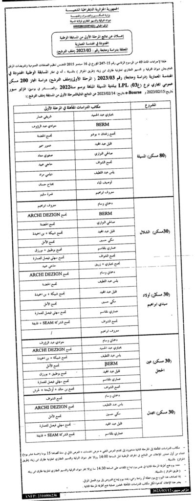 إعلان عن نتائج المرحلة الأولى من المسابقة الوطنية المحدودة في الهندسة المعمارية المتعلقة بدراسة ومتابعة 2023/03 (ملف الترشح)