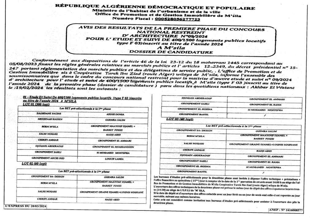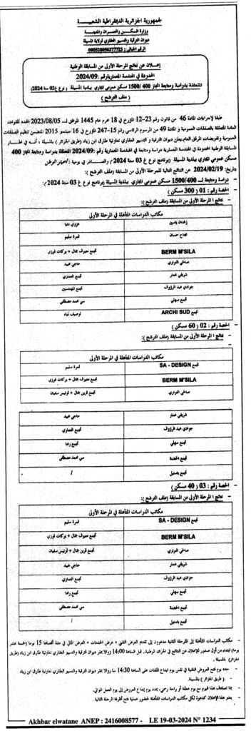إعلان عن نتائج المرحلة الأولى من المسابقة الوطنية المحدودة في الهندسة المعمارية رقم 2024/09: دراسة ومتابعة انجاز 1500/400 مسكن عمومي ايجاري بلدية المسيلة/ ديوان الترقية والتسيير العقاري لولاية المسيلة