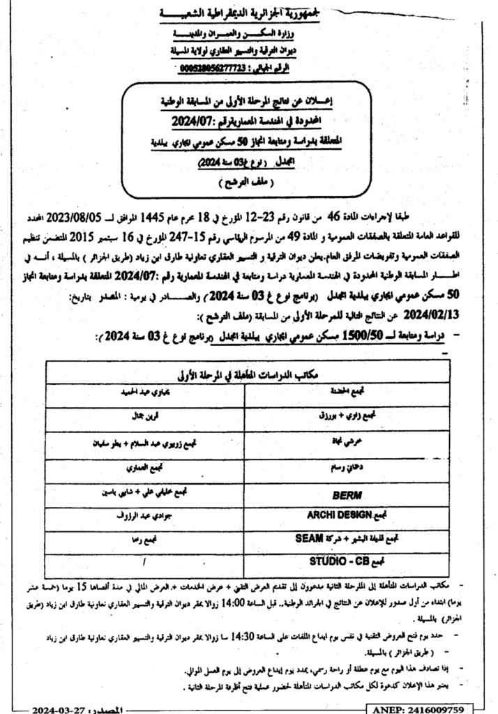 إعلان عن نتائج المرحلة الأولى من المسابقة الوطنية المحدودة في الهندسة المعمارية رقم 2024/07: دراسة ومتابعة انجاز 50 مسكن عمومي ايجاري بلدية امجدل/ ديوان الترقية والتسيير العقاري لولاية المسيلة
