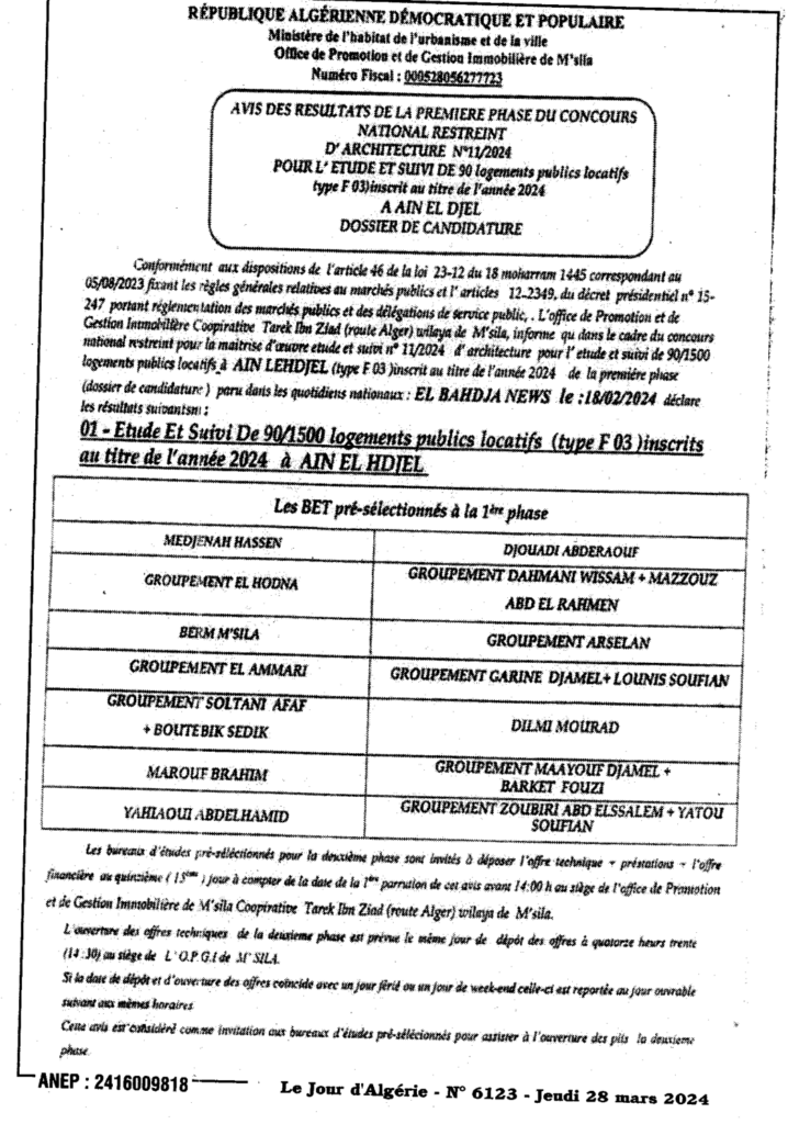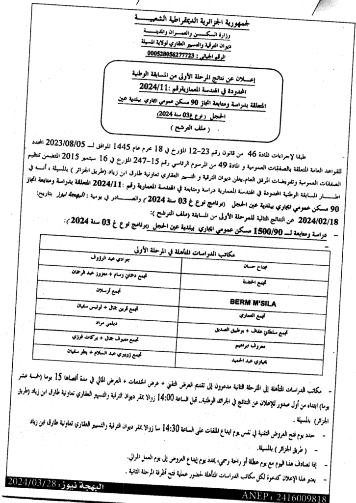 إعلان عن نتائج المرحلة الأولى من المسابقة الوطنية المحدودة في الهندسة المعمارية 2024/11: دراسة ومتابعة انجاز 90 مسكن عمومي ايجاري ببلدية عين الحجل/ ديوان الترقية والتسيير العقاري لولاية المسيلة